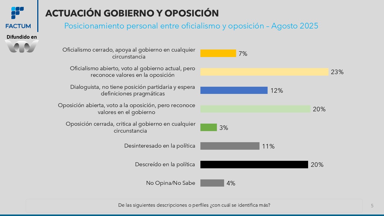 En la Encuesta Nacional FACTUM del mes de agosto se realizaron algunas indagaciones referidas a la evaluación de la población acerca de la actuación del gobierno y de la oposición, así como del posicionamiento político de las personas en términos de predisposión al diálogo o posiciones más intransigentes.
