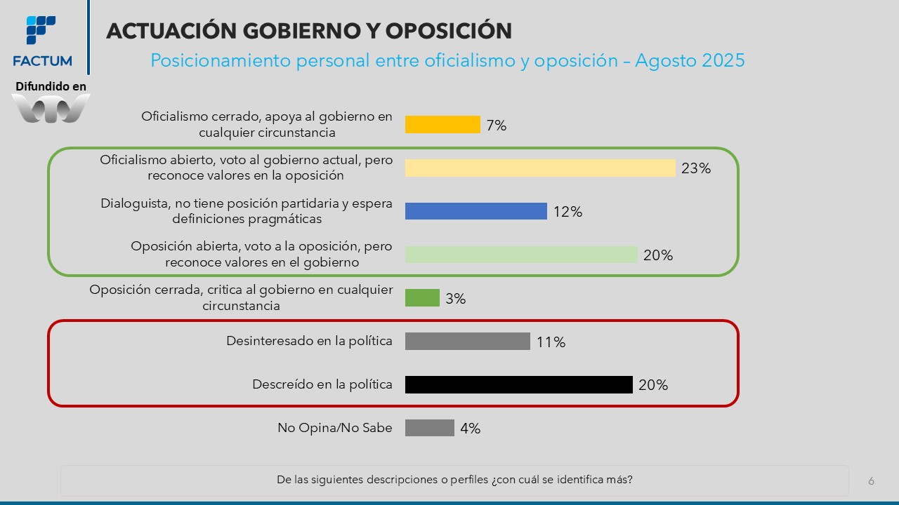 Más allá de cuántos se posicionan cercanos al oficialismo y cuántos cercanos a la oposición, surge claramente que las posiciones intransigentes son minoritarias, el 7% se define como "Oficialismo cerrado, apoya al gobierno en cualquier circunstancia" y un 3% se define como "Oposición cerrada, critica al gobierno en cualquier circunstancia".