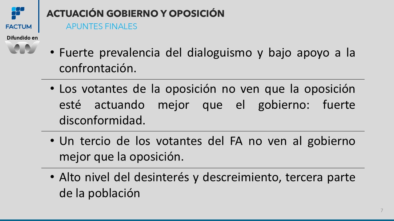 Fuerte prevalencia del dialoguismo y bajo apoyo a la confrontación. Los votantes de la oposición no ven que la oposición esté actuando mejor que el gobierno: fuerte disconformidad. Un tercio de votantes del FA no ven al gobierno mejor que la oposición. Alto nivel del desinteres y descreimiento, tercera parte de la población