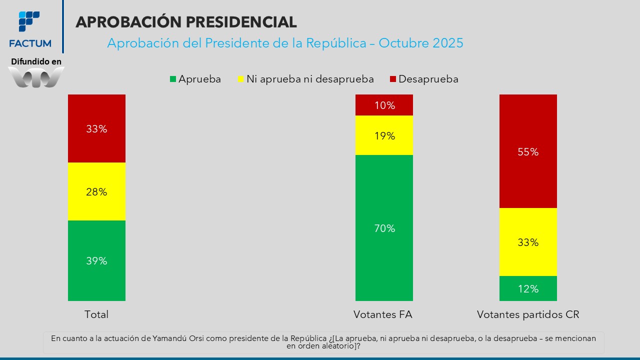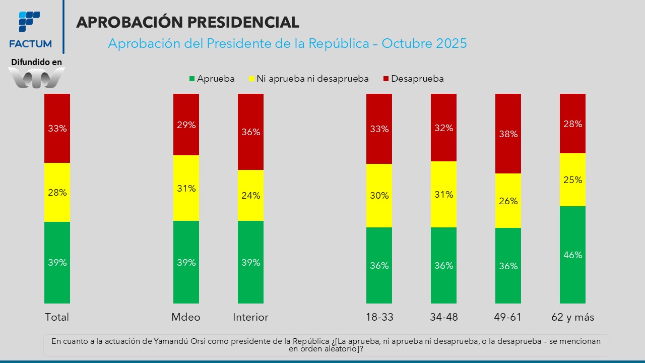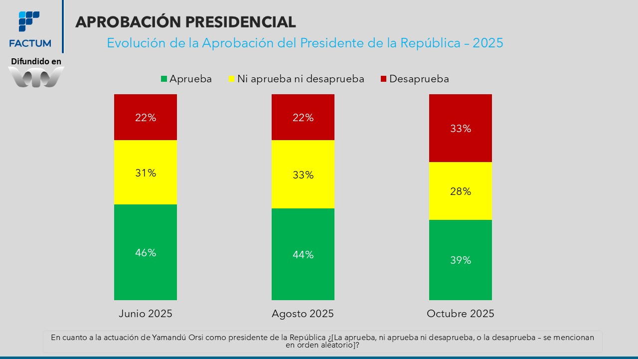 En la Encuesta Nacional FACTUM realizada entre el 23 de setiembre y el 12 de octubre se recogió como se hace regularmente el nivel de aprobación hacia la actuación de Yamandú Orsi como presidente de la República.